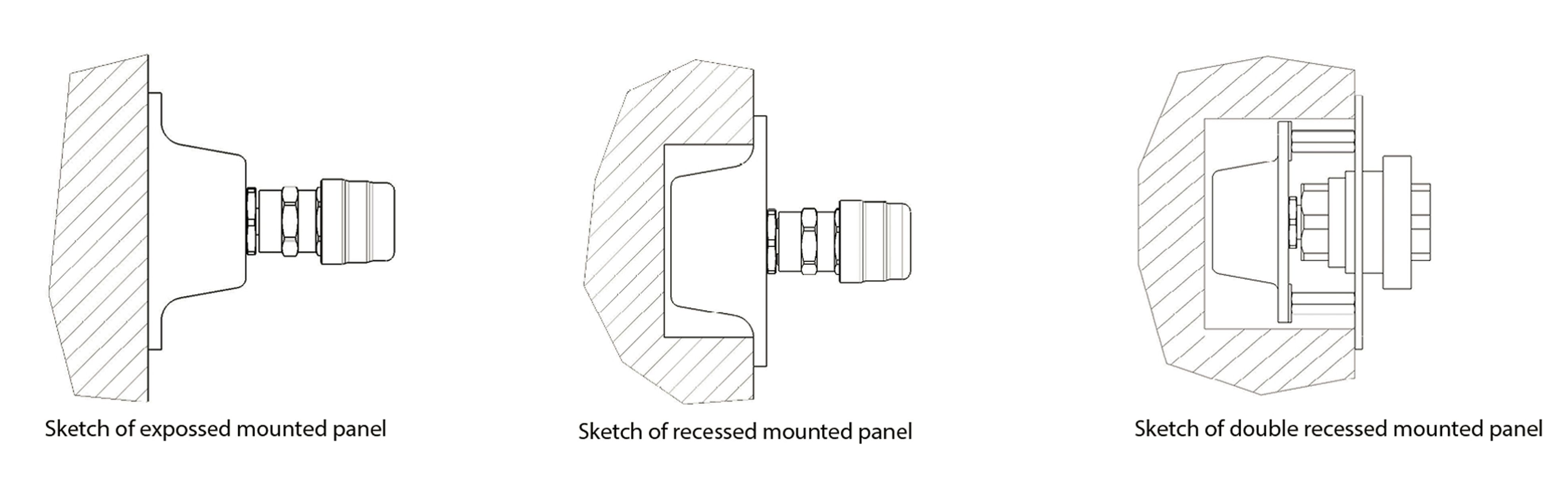 Recessed mounting is when the ambulance panel is mounted in the wall. The inlet could either be mounted at the end or at the back depending on the wall construction and the space behind the wall. The only part that will be outside the wall is the quick connector.